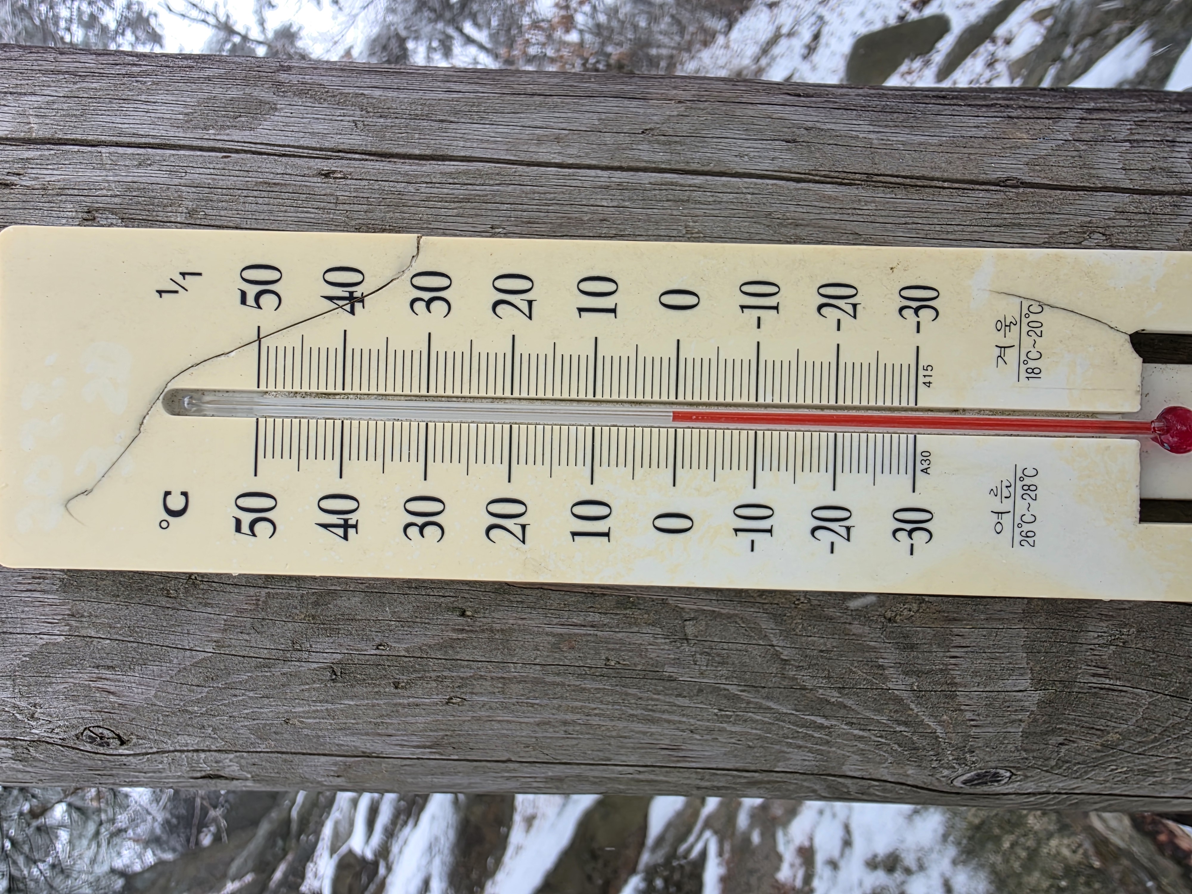 누군가가 걸어놓은 온도계는 정확하게 0도를 가리키고 있습니다.