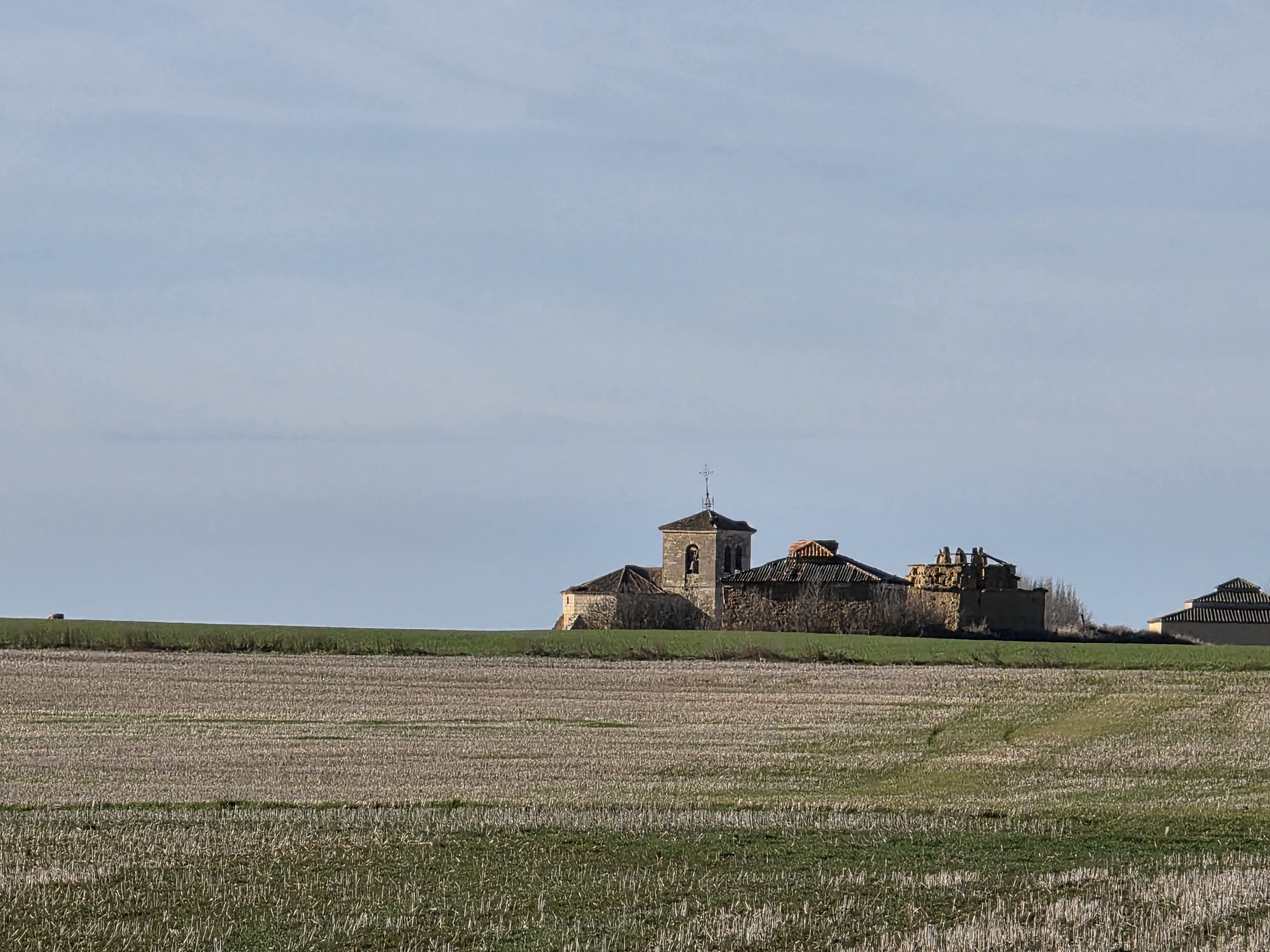 아무도 살지 않는, 언덕과 밭이 펼쳐진 곳에 빨간 지붕 외딴집. 산볼(San bol)이라는 동네, 들판에 홀로 나는 새처럼 자유롭던 까스텔라노스 데 까스트로(Castellanos de Castro)라는 마을에 하나뿐인 알베르게가 있다. 좀 더 자세히 찍고 싶어서 나아가다 보니 점점 몸을 숨긴다. 바람이 불어오는 언덕에서는 보이지 않았다. 바람이 아니었다면 다시 내려갔을 것이다. 아무도 없는 들길을 걷는다. 겨울 들판은 들밥처럼 정겹지 않다. 살면서 처음 길바닥에 앉았다가 드러누워버렸다. 해를 등진 안톤 유적지를 바라보면서 귤 한 개를 먹는다. 살면서 이토록 달콤한 귤을 먹었던 적이 있었던가.